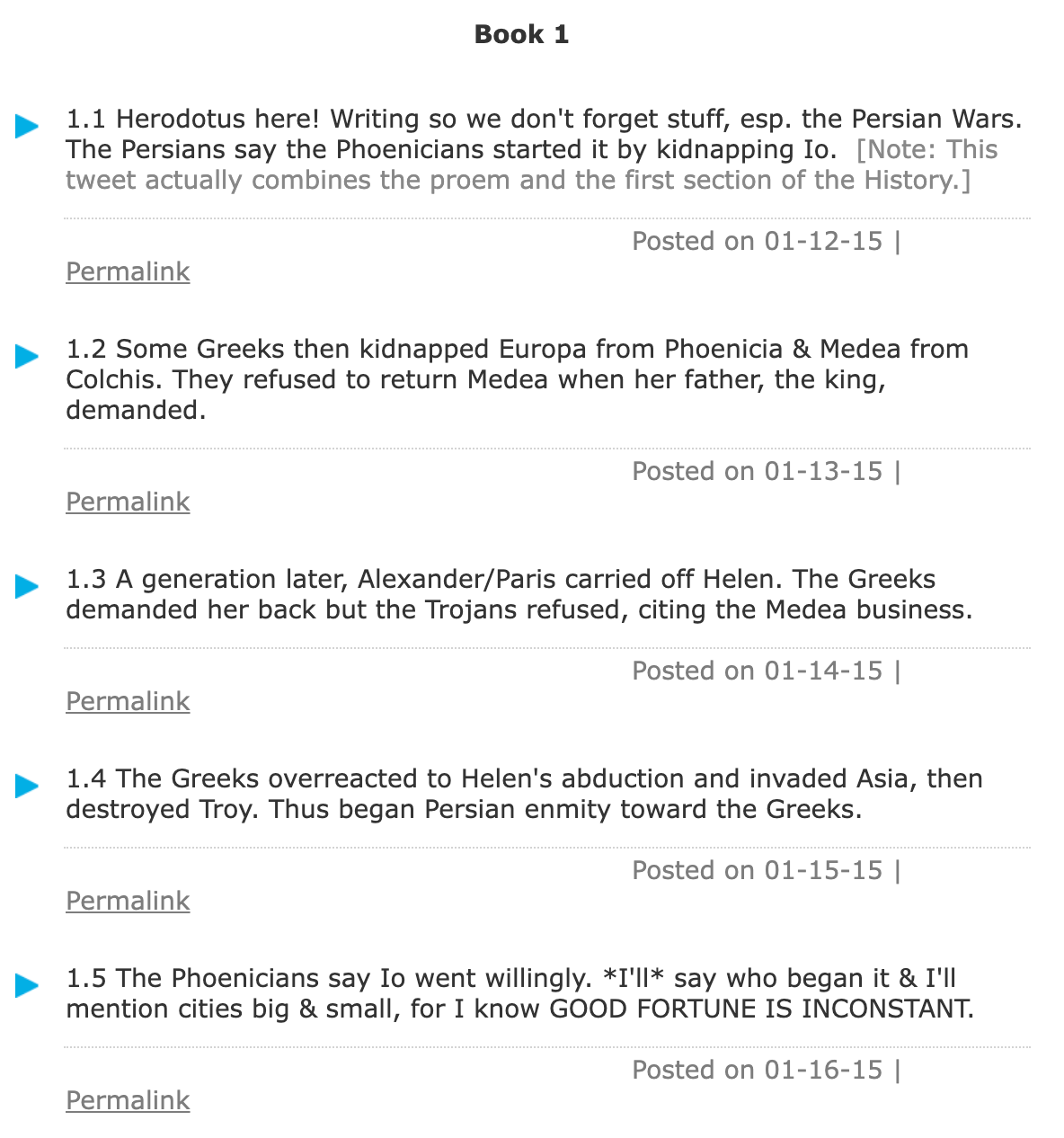 Between October 29, 2010, and January 12, 2015—when the world and Twitter were young—I assisted Herodotus, the Father of History, in tweeting an abbreviated version of his History of the Persian Wars, a "Twitter Herodotus" for the modern age. The rule was, one tweet per day (140 characters or less), one tweet per section of the History. After more than four years, it was finished, and I made the collected tweets available in paperback and for Kindle.